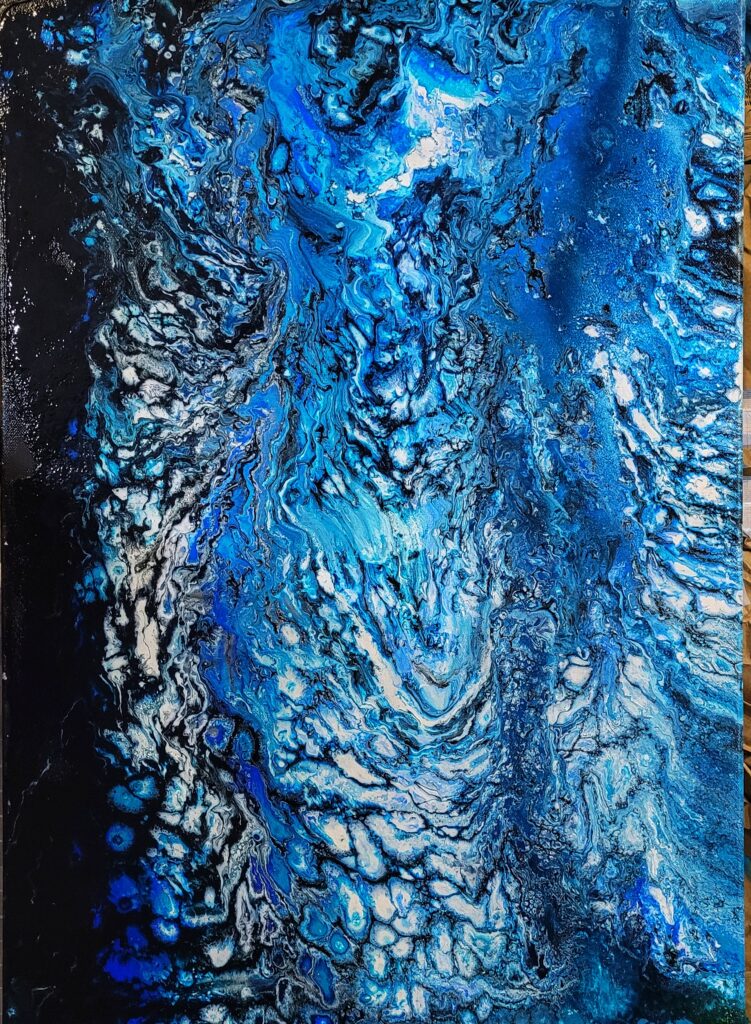 Ten ręcznie malowany obraz przedstawia dynamiczną abstrakcyjną kompozycję, wykonaną techniką pouringu. Dominują na nim odcienie błękitu, bieli i czerni, które tworzą płynne, organiczne formy. Kolory przenikają się nawzajem, tworząc skomplikowane wzory, które przypominają wirujące wody, kosmiczne mgławice lub lodowe pejzaże, a może morze? Struktura farby widoczna jest w formie drobnych detali i zawirowań, nadając obrazowi trójwymiarowy efekt i bogatą teksturę.