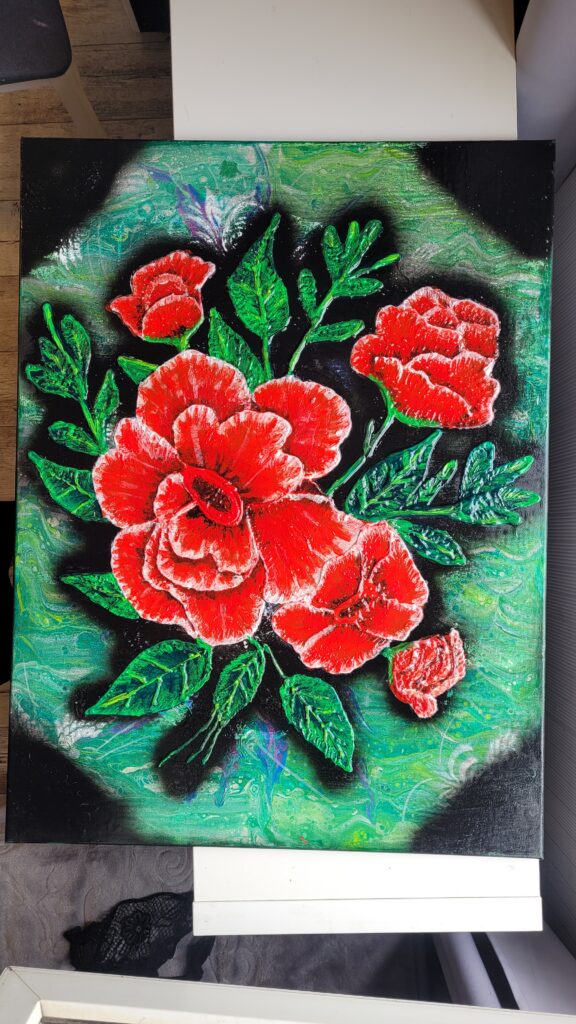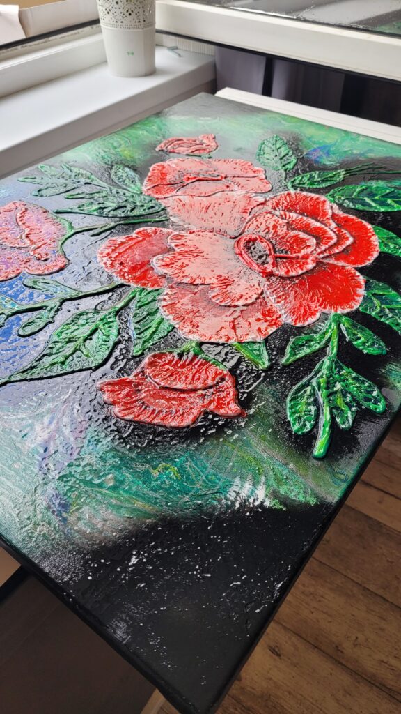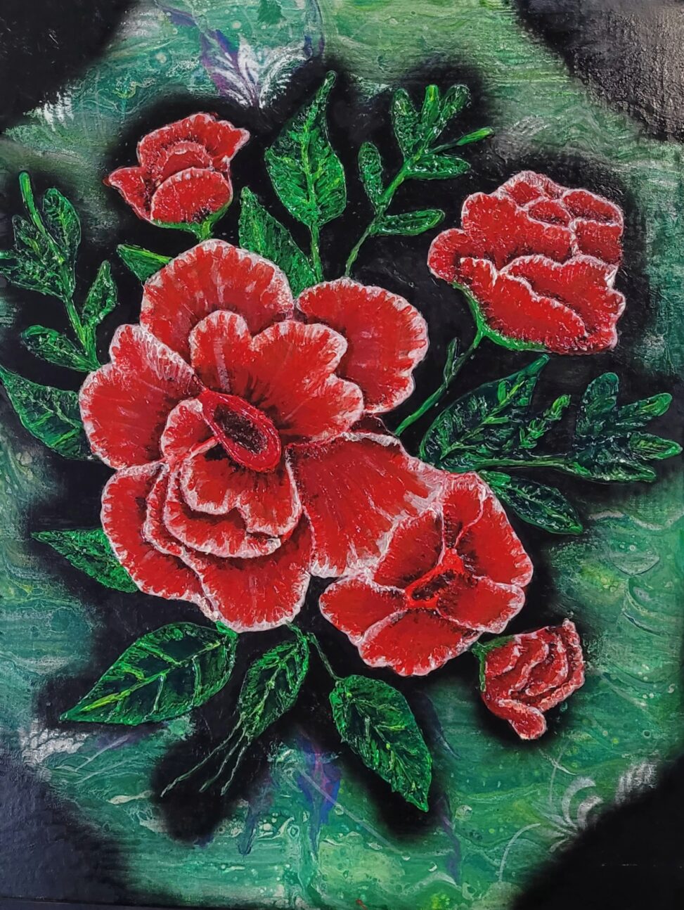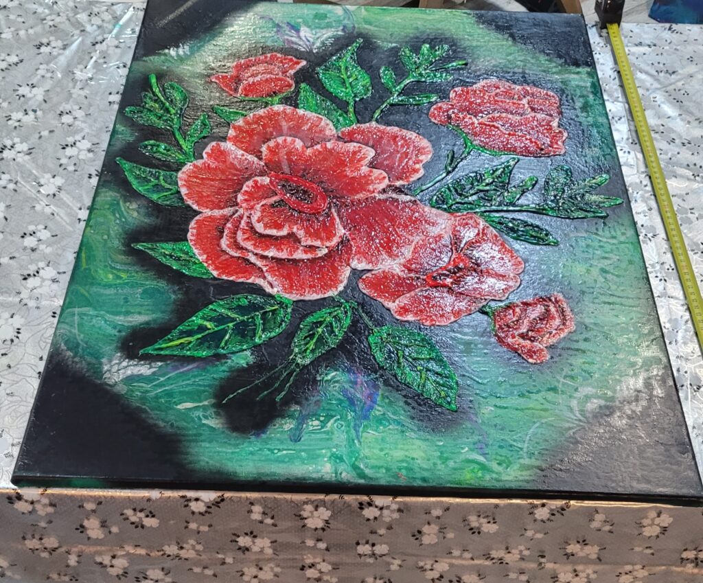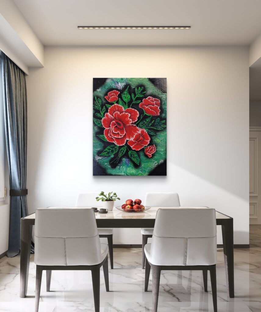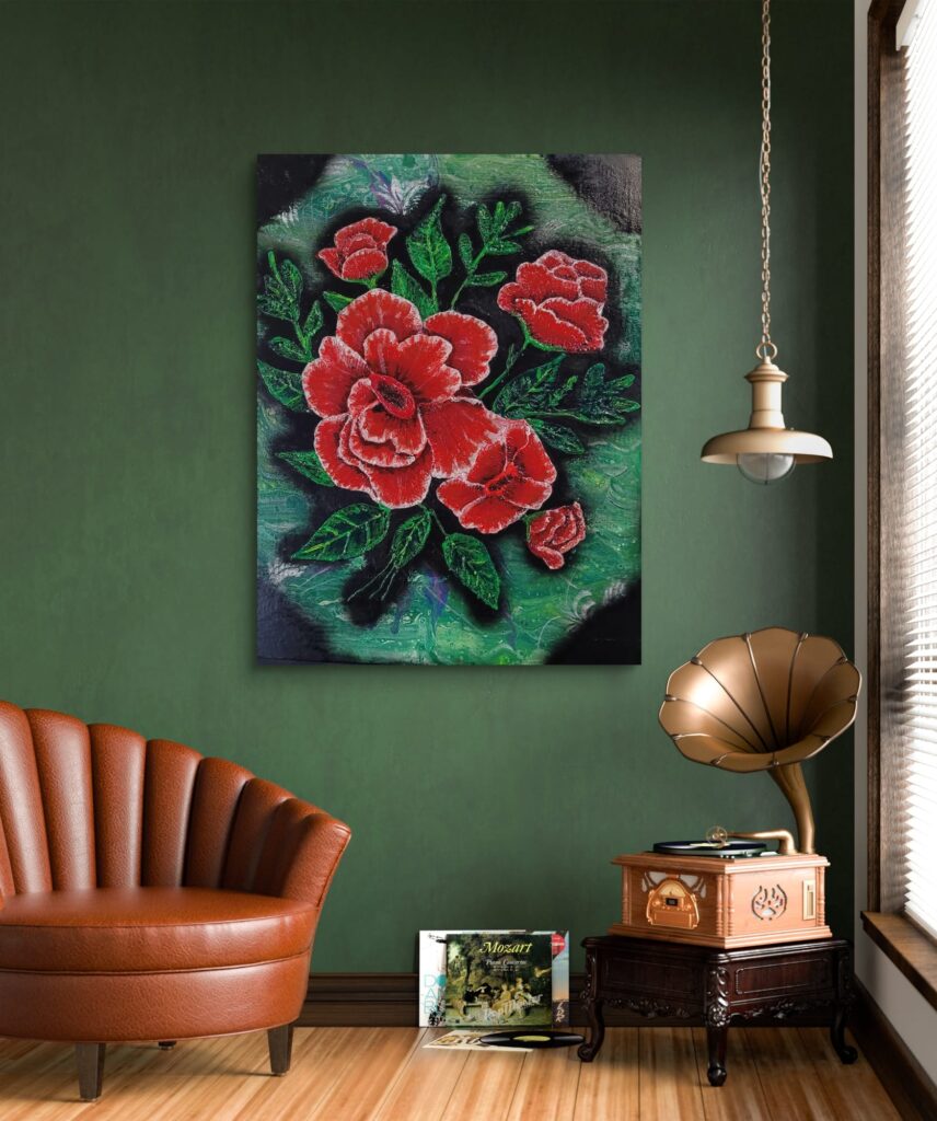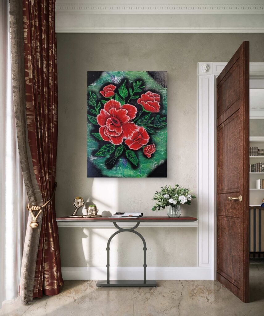 abstrakcyjny obraz róż, czerwone róże, dekoracja ścian, sztuka współczesna, nowoczesne wnętrza, obraz do sypialni, romantyzm w sztuce, miłość i piękno, sztuka do salonu, inspiracja artystyczna