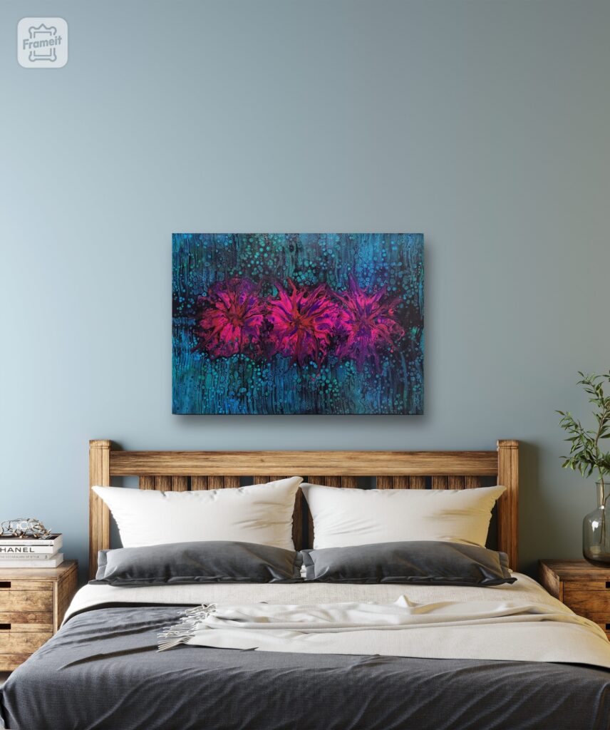 Obraz przedstawia trzy abstrakcyjne kwiaty w intensywnych odcieniach różu i fioletu na tle niebiesko-zielonej kompozycji. Kwiaty mają ekspresyjne, rozlewające się kształty, które sprawiają wrażenie ruchu i energii. Tło jest bogate w tekstury i drobne kropki, które nadają całości głębi i dynamizmu. Technika malarska zastosowana w tym obrazie tworzy efekt trójwymiarowości i różnorodność tekstur, co potęguje wrażenie intensywności i żywiołowości.