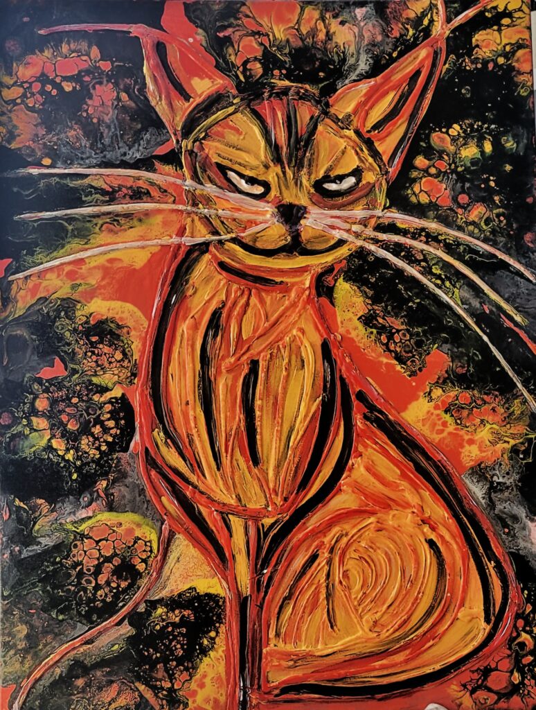 Obraz przedstawia abstrakcyjnego kota wykonany techniką malarstwa 3D. Głównym elementem kompozycji jest kot o intensywnych barwach pomarańczy, żółci i czerwieni, które kontrastują z ciemnym, niemal czarnym tłem. Tło jest dynamiczne, wypełnione różnorodnymi formami i kolorami, co nadaje całości wrażenie ruchu i energii. Technika użyta w obrazie nadaje mu trójwymiarowy efekt, potęgując wrażenie głębi i bogactwa tekstur. Dominujące kolory to pomarańcz, żółć, czerń i czerwień, które przenikają się nawzajem, tworząc harmonijną, lecz pełną kontrastów kompozycję.