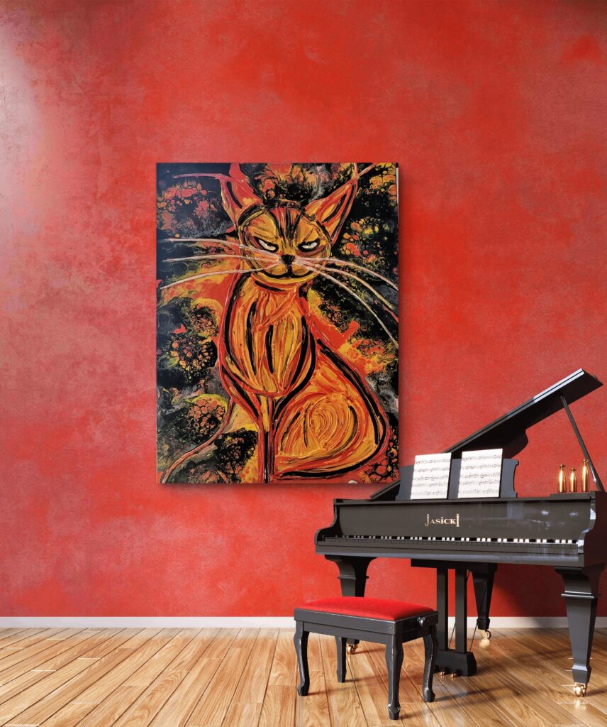 Obraz ten można interpretować jako symboliczne przedstawienie niezależności i tajemniczości, cech często przypisywanych kotom. Kolorowe tło, pełne intensywnych barw, symbolizuje różnorodność emocji i doświadczeń, które towarzyszą naszemu życiu. Kot, będący centralnym elementem kompozycji, może reprezentować wewnętrzną siłę, intuicję oraz niezależność. W kulturze koty często symbolizują tajemniczość, mądrość i duchową ochronę. Motyw kota może również odwoływać się do literatury, gdzie koty pojawiają się jako symbole wolności i magii, jak w „Mistrzu i Małgorzacie” Michaiła Bułhakowa, gdzie kot Behemot odgrywa znaczącą rolę w narracji pełnej tajemnic i zaskakujących zwrotów akcji.