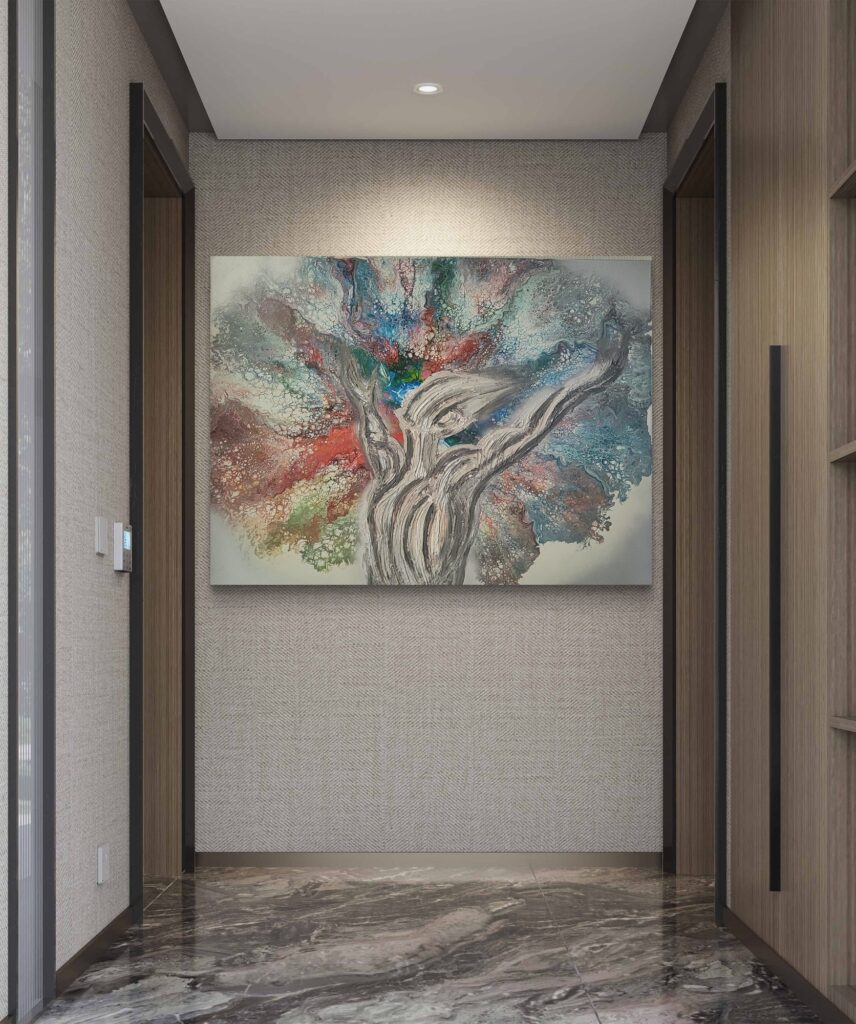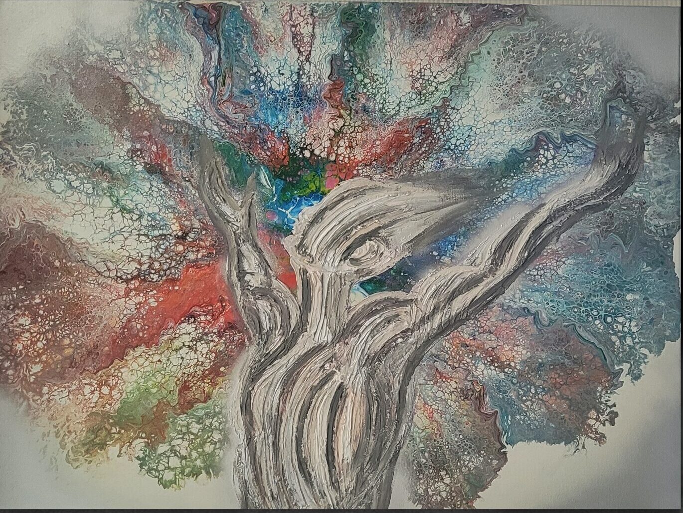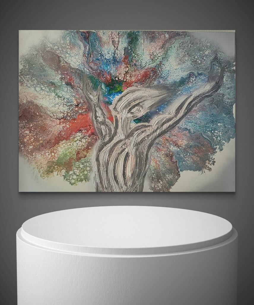 Obraz przedstawia abstrakcyjne drzewo wykonane techniką malarstwa 3D. Głównym elementem kompozycji jest drzewo o srebrzystych, fakturowanych gałęziach, które rozprzestrzeniają się na tle dynamicznego, kolorowego tła, przypominając ludzką postać. Tło jest pełne różnorodnych form i barw, co nadaje całości wrażenie ruchu i energii przypominającej kosmiczne zjawiska. Technika użyta w obrazie nadaje mu trójwymiarowy efekt, potęgując wrażenie głębi i bogactwa tekstur. Dominujące kolory to srebrny, czerwony, niebieski i zielony, które przenikają się nawzajem, tworząc harmonijną, lecz pełną kontrastów kompozycję.