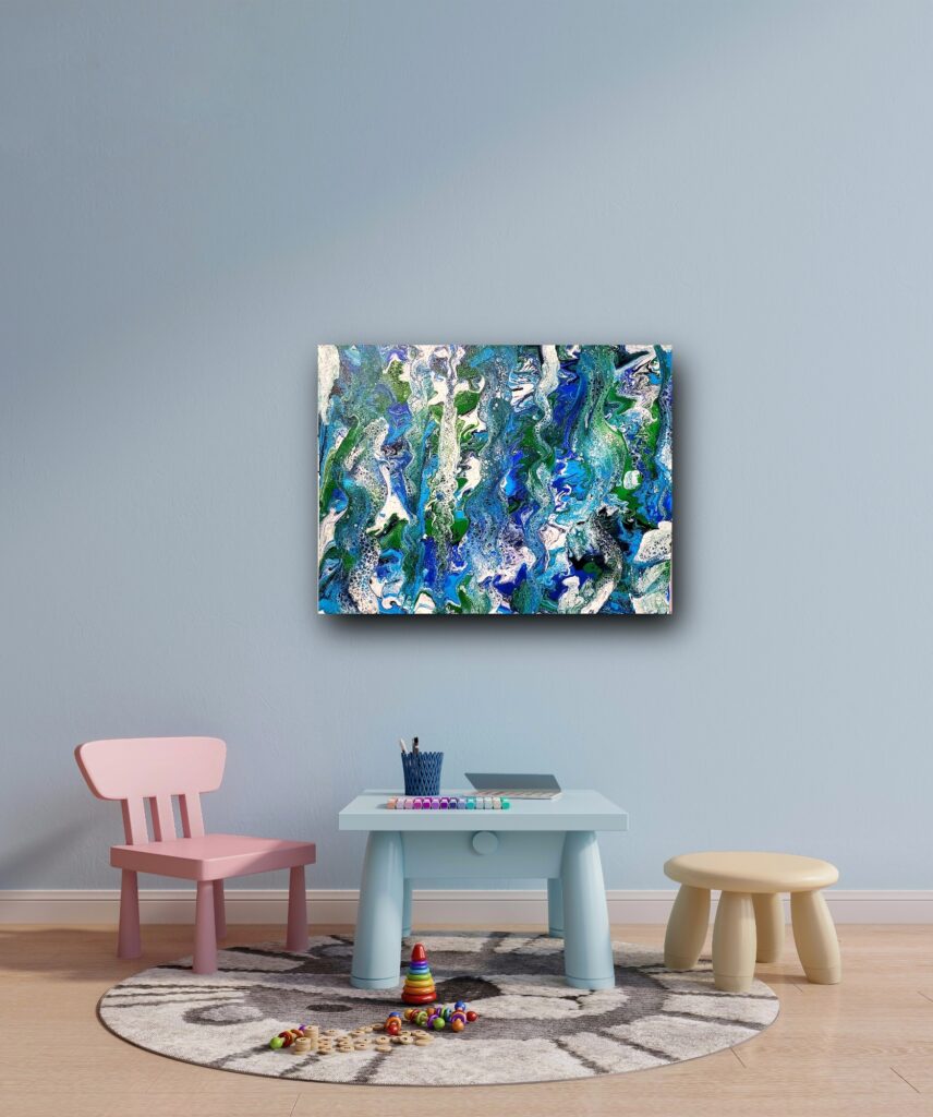 Obraz przedstawia abstrakcyjną kompozycję w odcieniach zieleni, błękitu i bieli, przypominającą wirujące, organiczne kształty. Kompozycja tworzy wrażenie płynności i ruchu, z efektem bąbelkowania i mieszania się kolorów. Struktura obrazu jest bogata w detale i tekstury, co nadaje mu trójwymiarowy wygląd.