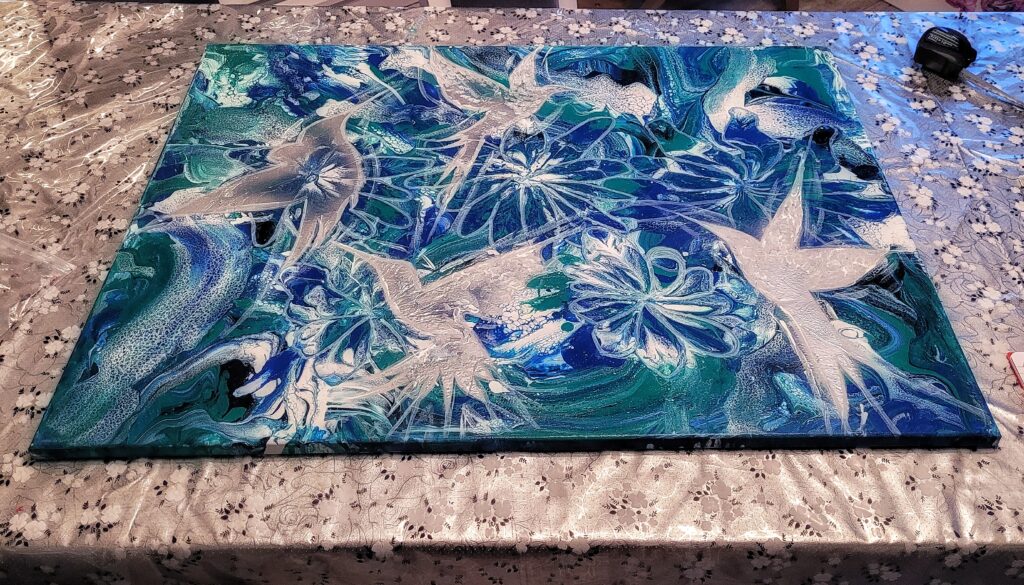 Obraz przedstawia abstrakcyjną kompozycję z dominującymi odcieniami niebieskiego, zielonego i białego. W centralnej części widoczne są delikatne, półprzezroczyste sylwetki ptaków w locie, które nadają całości lekkości i eterycznego charakteru. Tło obrazu jest dynamiczne, wypełnione organicznymi kształtami i teksturami, które przypominają fale lub wzory roślinne.